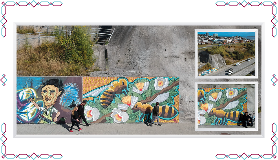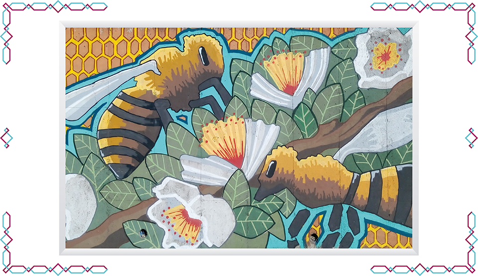 POLINIZACIÓN: “Mural de Abejas” realizado de manera auto-gestionada. Composición basada en la importancia de las abejas en el proceso de polinización de las plantas, flores y en la producción de miel de ulmo.